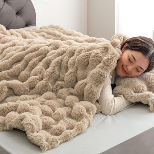2種類の肌触りを楽しめるリバーシブル仕様のふわとろ毛布。片面はなめらかなフランネル、もう片面はもこもこのラビットファー調で、気分に合わせて使い分けられます。高密度生地であたたかい空気を溜め込むため、寒い冬でも快適な睡眠環境を提供するアイテムです。