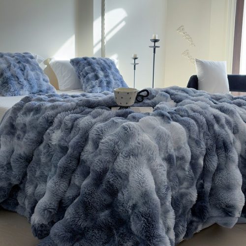 毛足の長いとろふわ毛布。表面はラビットファー調のもこもこ素材、裏面はとろけるようなフランネル生地で、異なる肌触りを楽しめます。表面は長い毛足を立たせ、ボリューム感のあるふわふわ感が魅力です。