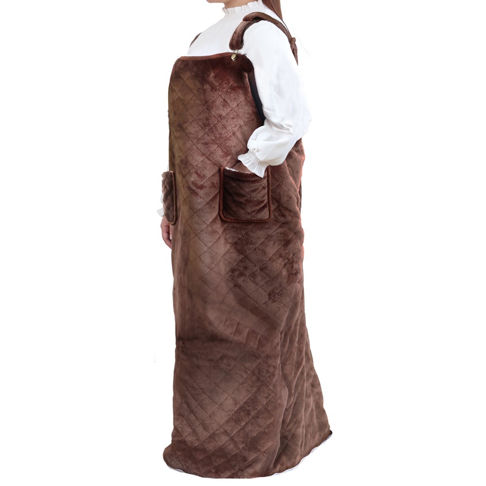 胸から足先まで包み込んで体をあたためる着るこたつ。ファスナーを開けば足を出して歩ける仕様で、着たまま自由に移動できます。ひざ掛けや敷きマットとしても使える仕様です。両サイドにポケットを備えており、小物の収納にも便利。肩紐はアジャスターで調整でき、ウエストもドローコードで好みのフィット感に調節できる仕様です。