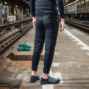 前面にダウン、後面にジャージ素材を使用した電熱パンツ。保温性の高さと動きやすさを兼ね備えているのがうれしいポイントです。また、表面は撥水加工が施されているため、汗や軽い雨などが染み込むのを防げます。