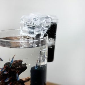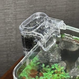 業界最小クラスと謳われたコンパクトな外掛けフィルター。USB給電で稼働するため、デスク上や棚の上に置く小型水槽にも対応できます。透明ボディを採用しており、ろ過槽内の汚れ具合を外から確認しやすいのが魅力です。