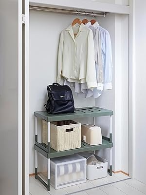 コの字タイプの、クローゼット収納におすすめのアイテム。2個セットで空間を効率的に活用でき、布団やバッグの収納に役立ちます。継ぎ脚を使えば高さを32cmまたは37cmに調整可能で、スペースに合わせて使い分けられるのが魅力です。