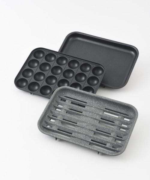 さまざま料理に対応しやすいアイテムです。本体は焼き肉プレートに加えて、たこ焼き・平面と3種類のプレートが付属します。焼き肉プレートは油を効率的に下に落とせる「Xカット構造」を採用。さらに、たこ焼きプレートには一大きい焼き穴を搭載しており、ボリュームのあるたこ焼きを楽しめます。