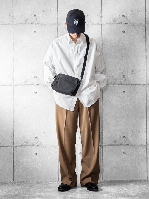シンプルな白シャツにグレーのワイドパンツを合わせたコーデです。シャツは程よくゆとりのあるサイズで、リラックスした雰囲気を演出。清潔感がありつつも、かしこまりすぎない抜け感を表現しています。