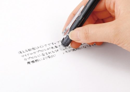 専用のラバーでこすると文字が消せるボールペンにも注目。こすったときに生じる摩擦熱を利用して、書いた文字を透明にします。60℃以上の熱でインクの色が消える仕組みで、消しカスを出さずに何度でも書き直し可能。予定の変更が多い場合や、メモ書きに便利です。