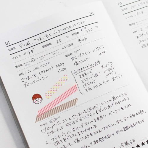 本製品は見開きレイアウトで、材料や作り方をゆったり書き込める設計。余計な項目がないため、イラストやシール、判子でデコレーションを楽しむこともできます。ビニールカバー付きで汚れや水濡れを防ぎ、キッチンに置いたまま使えるのもポイントです。