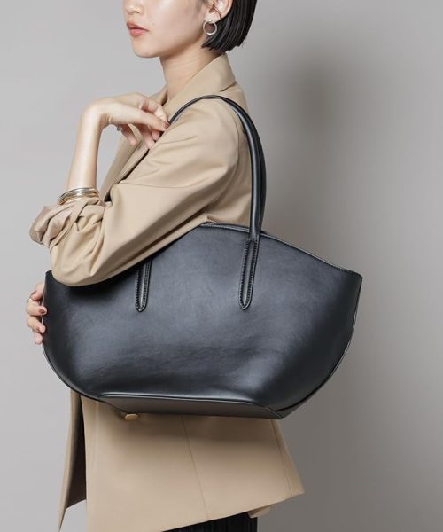 こなれ感を与える、ラウンド型のデザインが魅力のトートバッグです。ややシボ感のあるやわらかなフェイクレザーが上品な印象。大きく開く開口部や広めのマチを備え、荷物の出し入れがしやすいのもポイントです。