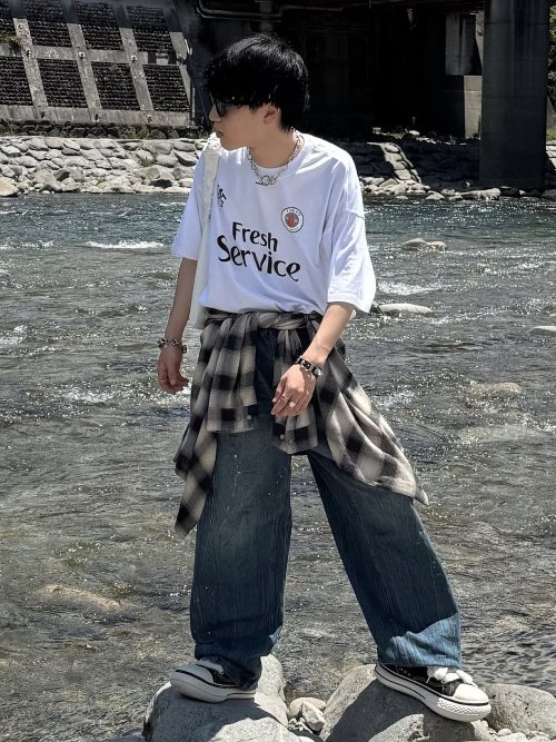 ロゴTシャツにルーズなシルエットのデニムパンツをあわせた夏のカジュアルコーデです。白とブルーを基調とした爽やかな配色に、オンブレチェックシャツを腰巻きすることで、着こなしにアクセントを加えています。シンプルな装いに程よく遊び心をプラスした、おすすめのコーデです。