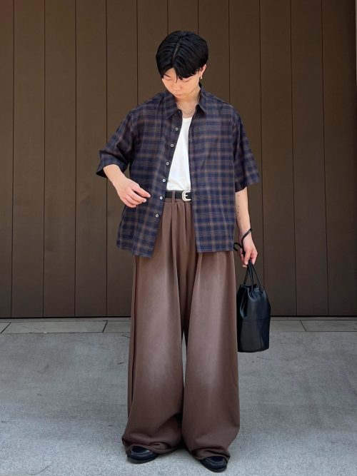 落ち着いた配色の半袖チェックシャツを羽織ったメンズコーデです。シンプルな白カットソーをチョイスし、抜け感を演出。ボトムスにはブラウンのワイドパンツをあわせ、全体をアースカラーでまとめています。韓国ファッションが好みの方におすすめのコーデです。