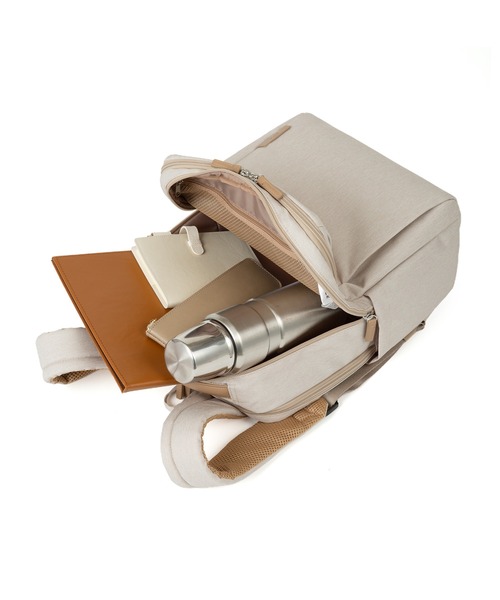 ビジネスからカジュアルまで幅広く使える、ジェンダーフリーなアクティブリュック。14.0インチのノートPCとA4ファイルの収納に対応し、通勤や外回りで活躍します。フロント上部にはスマートフォンや定期入れを収納できるファスナーポケット、フロントサイド部には特徴的なデザインのポケットを配置しているのが魅力です。