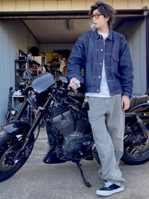 濃紺のデニムジャケットを主役にした、王道のアメカジスタイルです。インナーには白Tシャツをあわせ、程よい抜け感を演出。ボトムスはゆったりとしたグレーのワークパンツを選び、武骨な雰囲気にまとめています。