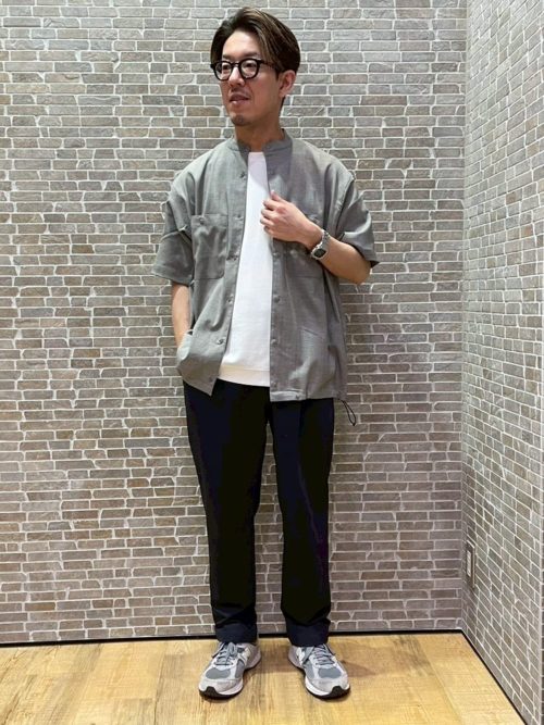 リネンライクなグレーの半袖シャツを羽織った、大人のリラックスコーデです。インナーにはシンプルな白Tシャツをあわせ、清涼感のある配色かつ爽やかな雰囲気。ボトムスはダークカラーのスラックスを選び、全体をスマートな印象にまとめています。