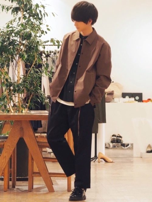 ブラウンのコーチジャケットに黒のシャツとテーパードパンツをあわせた、落ち着いた雰囲気のキレイめスタイルです。インナーとボトムスをブラックで統一しつつ、適度なゆるさのあるシルエットでこなれ感を演出しています。