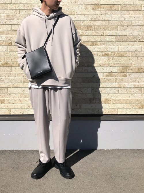 淡いベージュのパーカーに同色のスラックスをあわせた、セットアップ風のワントーンコーデです。ゆったりとしたシルエットのトップスから白のあたたかみあるインナーをのぞかせ、着こなしにメリハリをつけています。