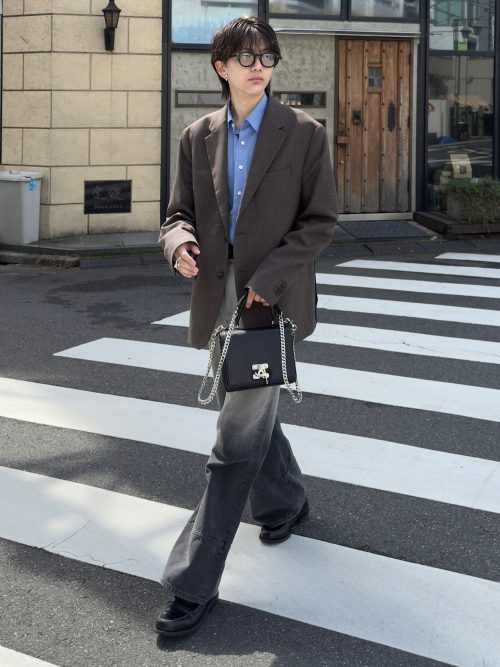 オーバーサイズのブラウンジャケットに、グラデーションが特徴的なグレーのデニムパンツをあわせたキレイめカジュアルコーデです。インナーには明るいブルーのシャツを選び、清潔感のある知的さを演出。ゆったりとしたシルエットでトレンド感を漂わせています。