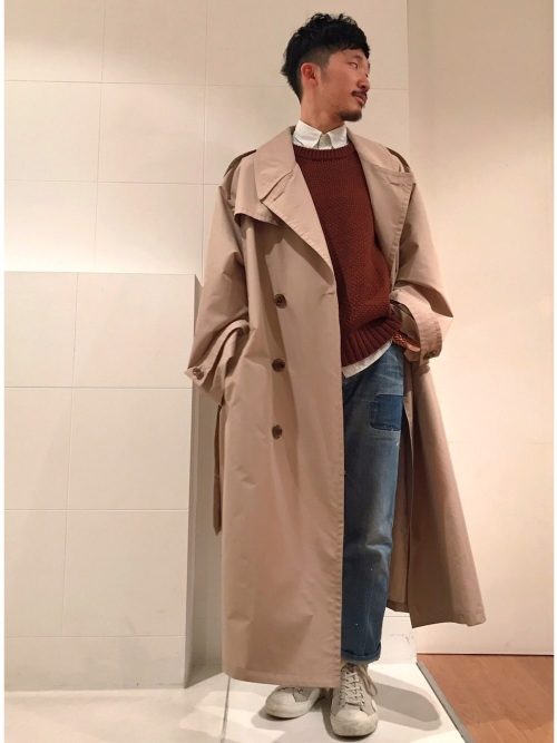 ベージュのオーバーサイズトレンチコートを主役にした、大人のカジュアルスタイルです。インナーには深みのある赤茶色のニットをあわせ、あたたかみをプラス。白シャツを首元からのぞかせ、清潔感を加えています。