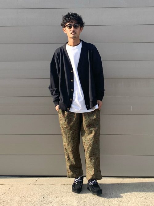 黒のルーズなカーディガンに白Tシャツをレイヤードした、リラックスムード漂うスタイル。ボトムスには存在感のあるカーキの総柄パンツをあわせ、個性的なアクセントを加えています。