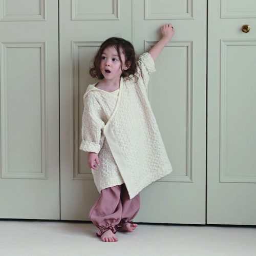 お風呂上がりにサッと羽織らせて湯冷めを防げるベビーバスローブです。オーガニックコットンのワッフル生地を採用し、さらりとした着心地を実現しています。タッセル付きのとんがりフードがかわいいデザインです。
