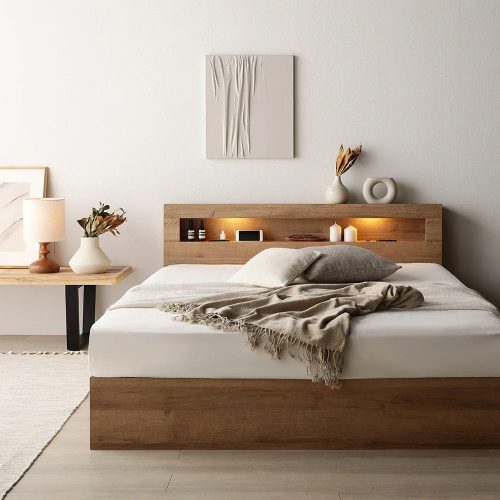 電球色のLED照明で寝室をおしゃれに演出するベッド。柔らかな光が就寝前のリラックスタイムを快適にします。洗練されたシンプルモダンなデザインで、本物の木や石を感じるような質感にこだわった高級感のある仕上がりが魅力です。
