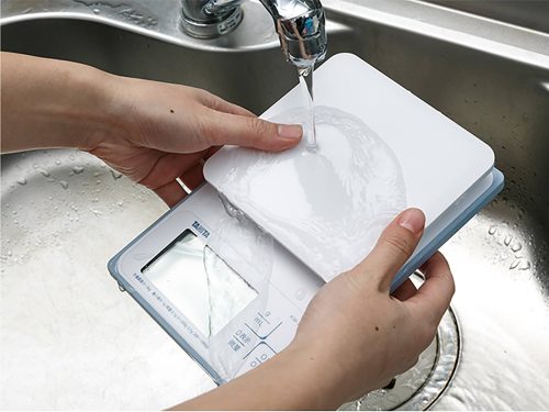 丸洗いできるクッキングスケール。IP65の防水・防じん仕様で本体をそのまま水洗いでき、粉類が内部に入り込む心配もありません。水や牛乳の計量をmLで表示するmLモードも搭載しており、料理やお菓子作りを効率よく進められます。