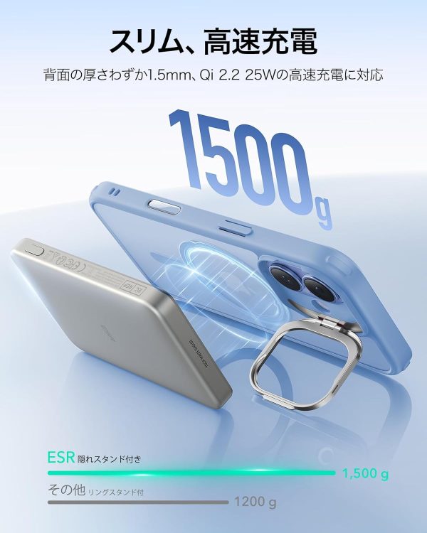 MagSafeの利便性を左右する磁力についても、ESRのiPhoneケースは非常に優秀。Classicが約1500g、Cloudが約1400gに耐えられるという強力な磁力を有しています。実際にモバイルバッテリーを装着して持ち歩いても、ズレや落下の不安を感じず、安定感がありました。
