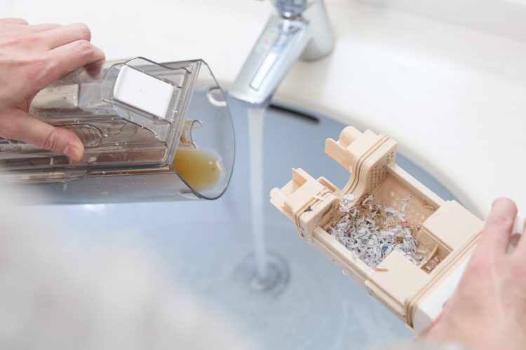 MOVA K30 SEの内部に備えられているフィルターコンテナは、固形ゴミと液体ゴミをしっかり分離する構造。溜まったゴミはそのままゴミ箱へ、汚水は水道に流すだけと処理がとてもスムーズです。実際に使ってみると、固形と液体が混ざって処理しにくいなどの問題が発生せず、後処理が想像以上に楽に感じました。