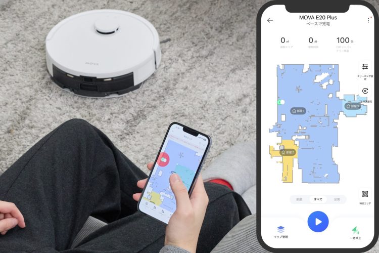 MOVA E20 Plusは、スマホアプリ「MOVAhome」と連携することで、清掃体験がより自由になります。吸引力や水拭きの水量調整はもちろん、詳細なフロアマップ作成や進入禁止エリアの設定も指先で完結。自分のライフスタイルに合わせて、ロボットの動きを細かくカスタマイズできるのが最大の魅力です。