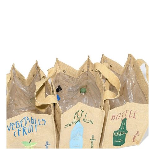 キャンプ場でのゴミ分別に役立つ、折りたたみ式のバッグ型ゴミ箱3個セット。ナチュラルな麻素材の表面にはイラストが描かれており、ゴミの内容がひと目でわかります。自立する設計で、サイドの面ファスナーを使うと3個を連結して並べられるのがポイントです。