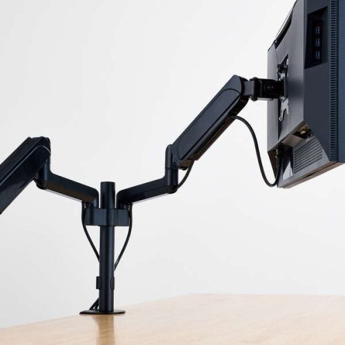 2台のディスプレイを自由に動かして配置できるモニターアームです。上下左右に角度が調節できるほか、高さの変更も行えます。画面を回転させる機能も備えており、縦方向に画面を固定できるのもポイントです。