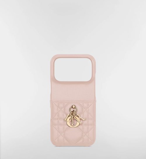 「カナージュ」ラムスキンを使用したエレガントなiPhoneケース。パウダーピンクのボディに、ペールゴールドトーンのD.I.O.R.チャームがアクセントを添えます。実用性と洗練された魅力を兼ね備えたデザインが魅力です。