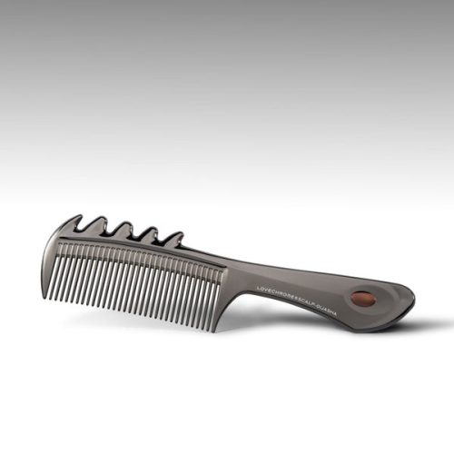 髪をとかすだけでなく、カッサとしても使えるラブクロムのコーム。背面に備わったカッサ部分は、頭皮や顔まわりにも使いやすい形状です。