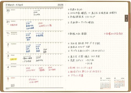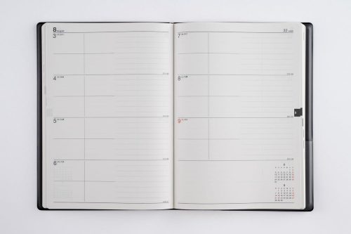 ウィークリーページは、左ページに予定、右ページにはメモを書き込める実用的なレイアウトを採用。多忙な日々を過ごす方の予定管理をしっかりサポートします。