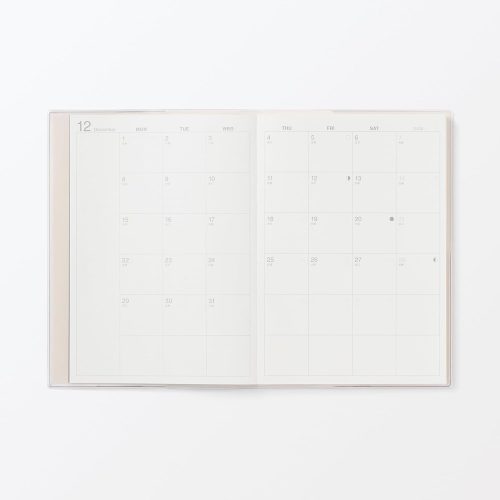 生活雑貨・食品・家具など、幅広いアイテムを取り扱う無印良品のウィークリー手帳です。月間ページ・週間ページともに月曜始まりで、平日の予定を把握しやすいのが特徴。年間カレンダーやフリーページも備えており、1年を通して快適に使用できます。