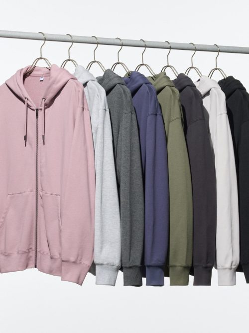 コットン素材のジップアップパーカーは、カジュアルな印象のモノが多いですが、細い糸を使用したツヤ感のあるアイテムであれば、きれいめなスタイルにも合わせやすくなります。シンプルで着まわしやすいデザインのアイテムが多数展開されているので、ぜひチェックしてみてください。