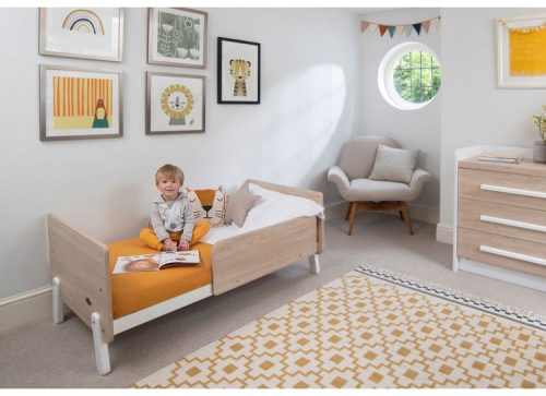 1台で6通りの使い方ができるベビーベッド。床板の高さを下げることで、つかまり立ちにも対応可能です。ベッドガードを取り付ければ、添い寝用ベッドやキッズベッドとしても活躍。さらに、オプションパーツでサイズを延長すると、ジュニアベッドになります。