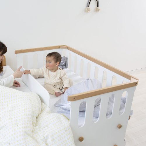 両サイドにスライド式の開閉扉を備えたベビーベッドです。左右どちらからでも簡単にアクセスできるため、部屋のレイアウトに合わせて使えるのが特徴。床板までの高さは最大約76cmあり、立ったまま赤ちゃんのお世話ができる設計です。