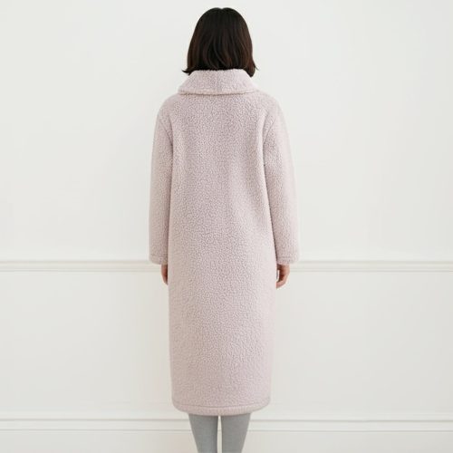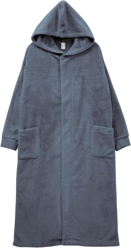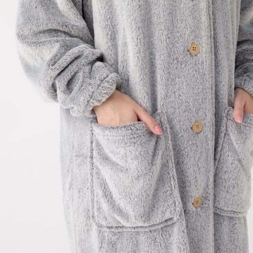 シープボア素材を使用し、ふわふわとした肌触りが特徴の着る毛布。足元まで包み込む超ロング丈で、全身をあたたかく保ちます。フロントボタン仕様で寝るときもはだけにくく、フードなし設計により横になっても首元が邪魔になりません。