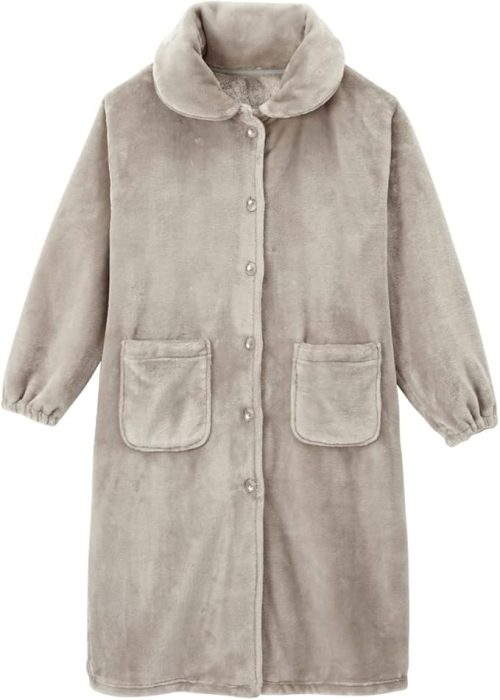 前開きボタン仕様で着脱が簡単。袖口はゴム入りで家事がしやすく、両サイドには大きめのポケット付きで実用性にも優れています。お尻まですっぽり隠れる着丈で腰まわりもしっかりカバー。寒い季節に部屋でリラックスしたい方におすすめのアイテムです。