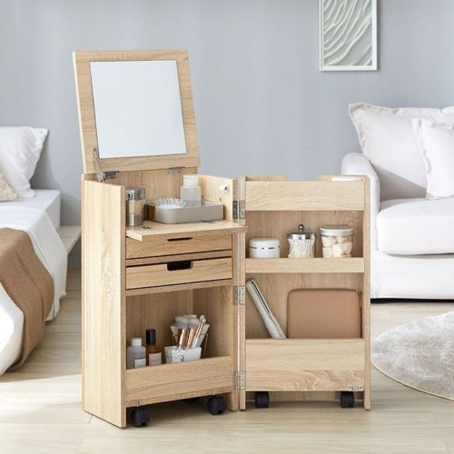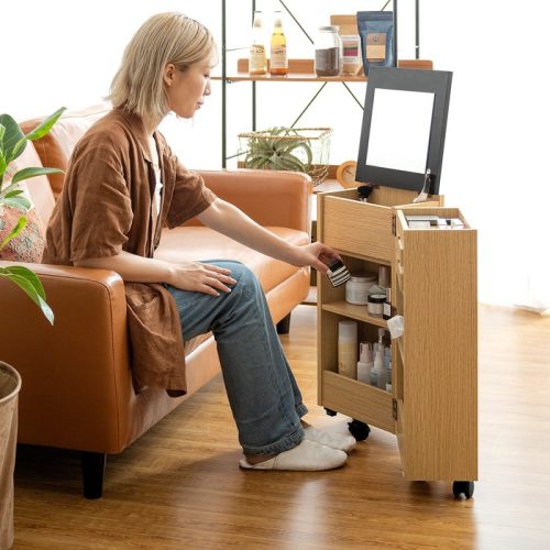 キャスター付きのワゴンタイプは、好きな場所に簡単に動かせるのが魅力です。コンパクトなサイズながら収納力があり、メイクやコスメの整理に役立ちます。使うときだけそばに引き寄せて、使わないときは部屋の隅に置けるのがポイントです。