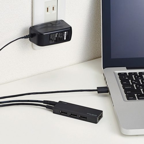 セルフパワータイプのUSBハブは、付属のACアダプタをコンセントに差して電力を供給するのが特徴です。PCからの給電に頼らないため、電力供給が安定します。