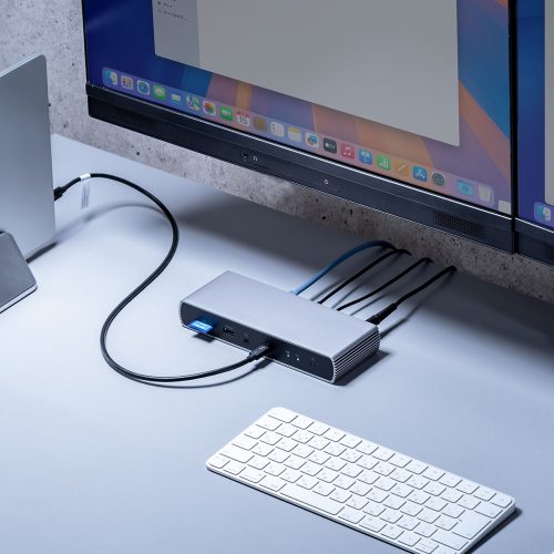 最大2画面で出力できるUSBハブです。Thunderbolt4ポートとHDMIポートを使うことで、最大2画面に映し出せます。マルチディスプレイ環境を作りたい方や、MacBookのクラムシェルモードを使う方などにおすすめです。