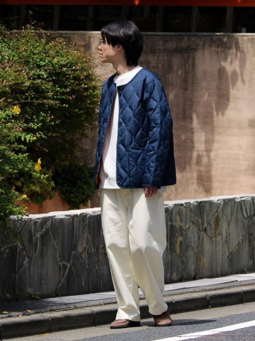 少し癖のある見た目のキルティングジャケットですが、さまざまなスタイルに合わせやすいのが魅力。デイリーカジュアルには、デニムやワークシャツと合わせやすいリラックスしたデザインがおすすめです。