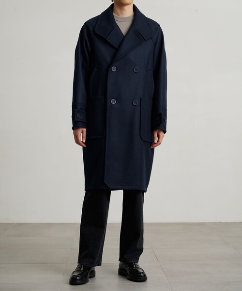 SUPER110’sウール原料を使用した、2重織りメルトンのピーコートです。生地にはハトー社のハードプレス加工を施し、表面の美しさを追求。襟を立てたときの見栄えにもこだわって作られています。