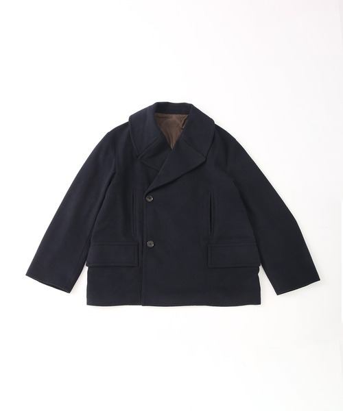 毛足の長いウール混メルトン生地を使用した、スタイリッシュなピーコート。ショート丈のシルエットやシングルボタンのデザインが、すっきりとしたルックスを演出しています。トレンドのゆるニットやパーカーと好相性で、レイヤードスタイルにもおすすめのアイテムです。