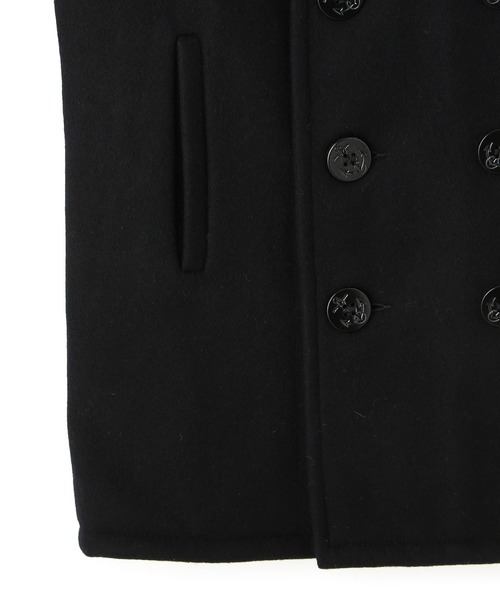 ウール95%とナイロン5%を組み合わせた、ヘビーメルトン生地のピーコートです。幅広のラペルを採用しているため、立襟スタイルで防寒性を高めるのもおすすめ。付属のチンストラップで冷気の侵入を軽減することも可能です。