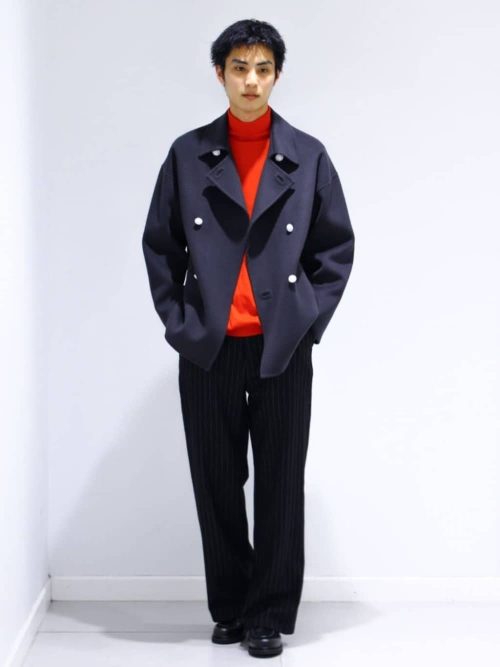 カジュアルなコーディネートが多い方には、ショート丈のピーコートがおすすめ。ジャケット感覚で気軽に着こなせます。デニムにあわせやすいのはもちろん、ジョガーパンツなどのスポーティーなアイテムとも相性がよくおすすめです。