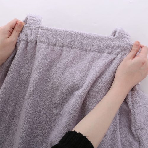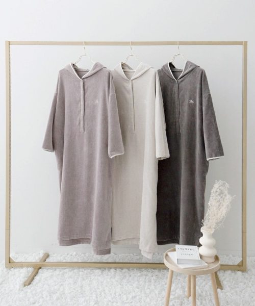 頭からサッと着用し、ウエスト部分をドロストで調整する簡単仕様。ヘアブラシなどの小物が入るフロントポケット付きで便利です。赤ちゃんとの入浴後のほか、ジム・プールでも重宝します。リラックスタイムを重視する方におすすめです。
