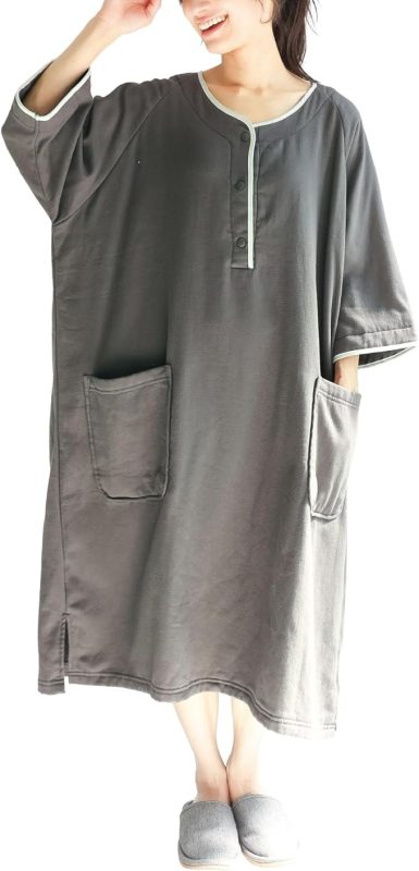 首周りが広く、頭からすっぽり被れます。胸元を大きく開けるデザインで、授乳期のママにもぴったり。大きなポケットが付いており、スマホや保湿クリームなどを持ち歩けます。赤ちゃんとの入浴にも活躍するおすすめアイテムです。