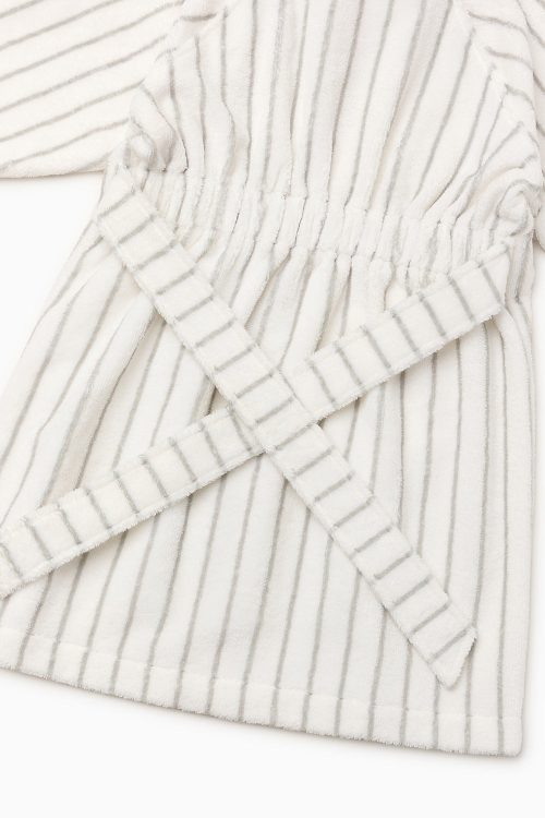 今治タオル地を使用した軽いバスローブです。愛媛県今治産の認定番号付きタオル地を用いており、優れた速乾性と吸水力を実現。上品なストライプデザインが、洗練された印象を与えます。