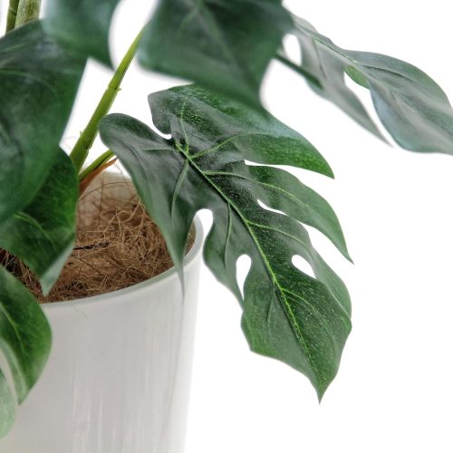 大胆な切れ込みが入った12枚の葉が魅力のフェイクグリーン。ミッドセンチュリーのアイコン的存在であるモンステラを再現しており、本物と見間違えるほどのリアルな質感が特徴です。銀配合のプレミアム光触媒コーティングにより、ニオイを軽減したり空気中の有害物質を分解したりする働きがあります。